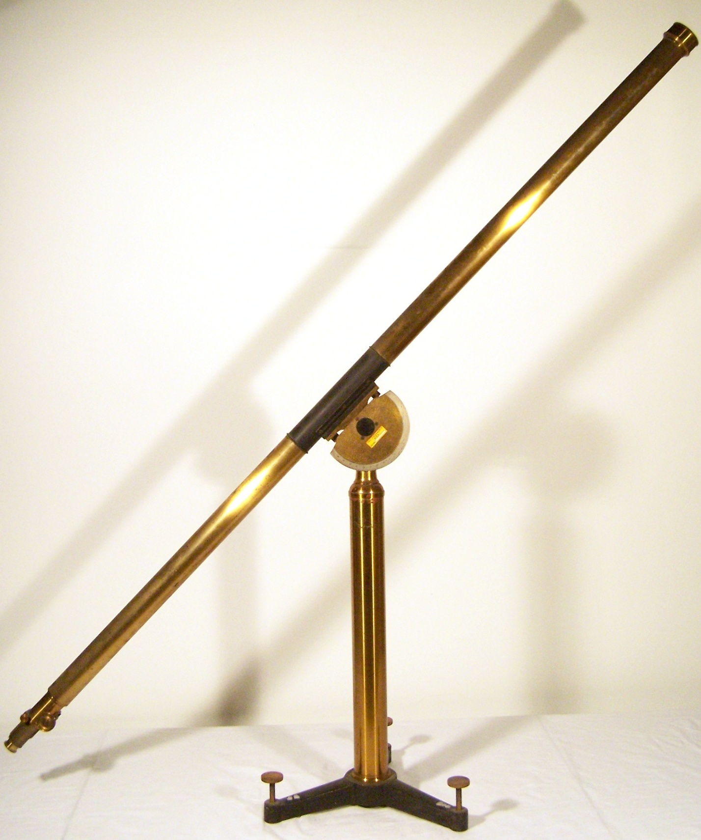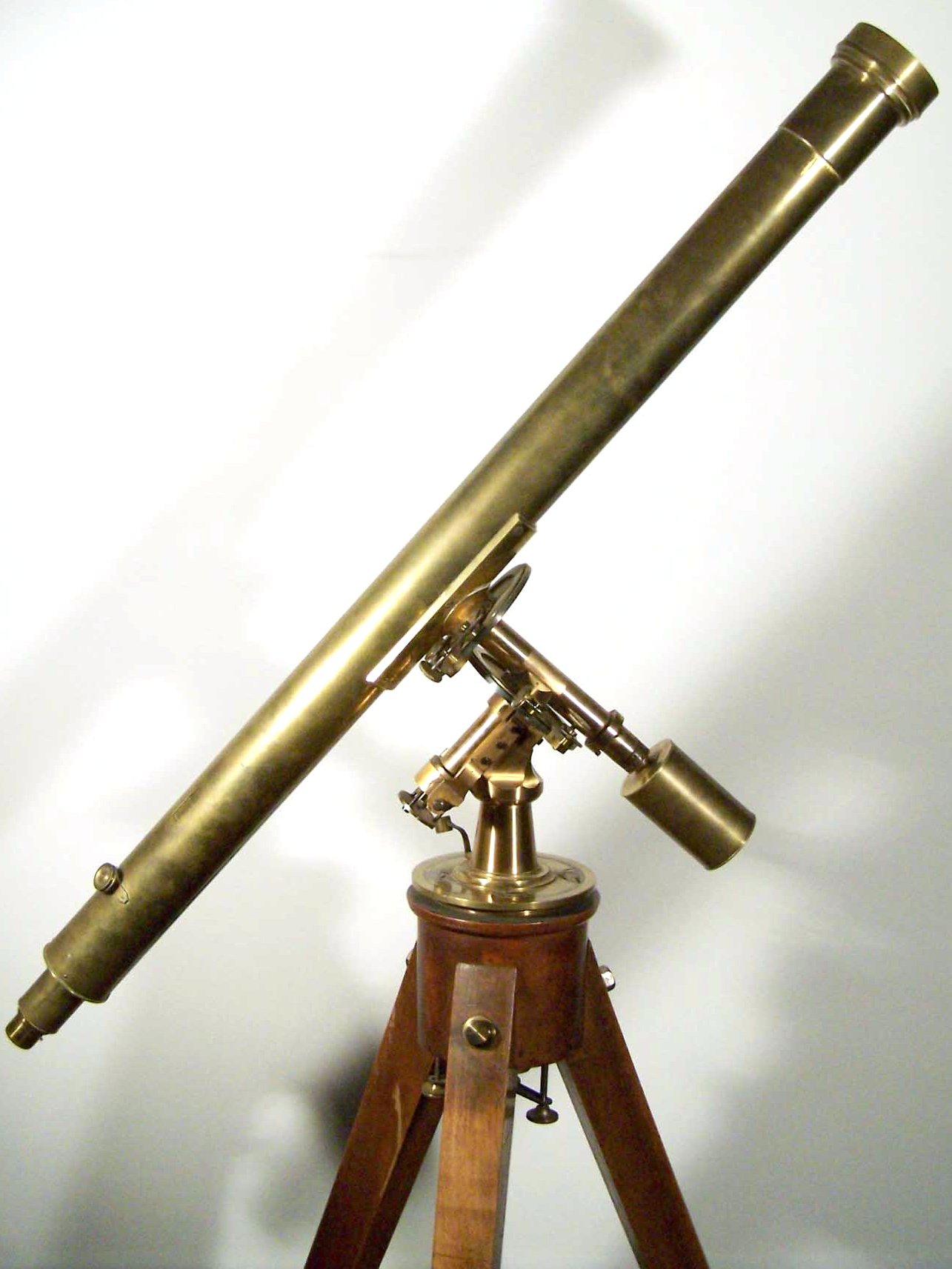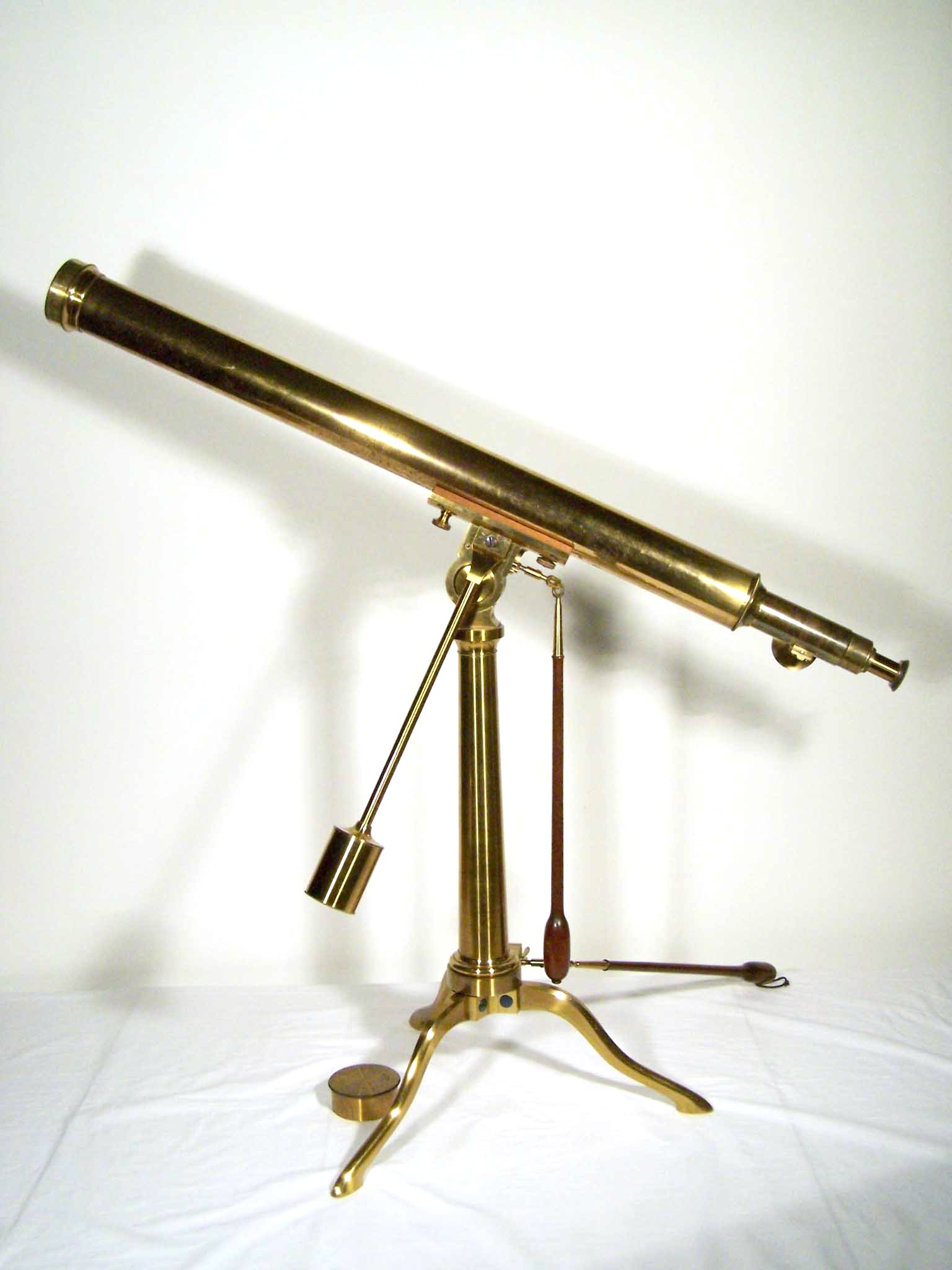Messing; auf Tischstativ mit Mittelsäule, Höhe 44,5 cm, 3 einklappbaren, geraden Füßen, azimutaler Montierung mit seitlich abgewinkeltem Gegengewicht, Durchmesser Objektiv 7,8 cm, Durchmesser Okular 1,25 cm, Objektivschutzkappe an den Lötstellen gebrochen; Höhe ges. 53 cm, Länge Fernrohr 40 cm