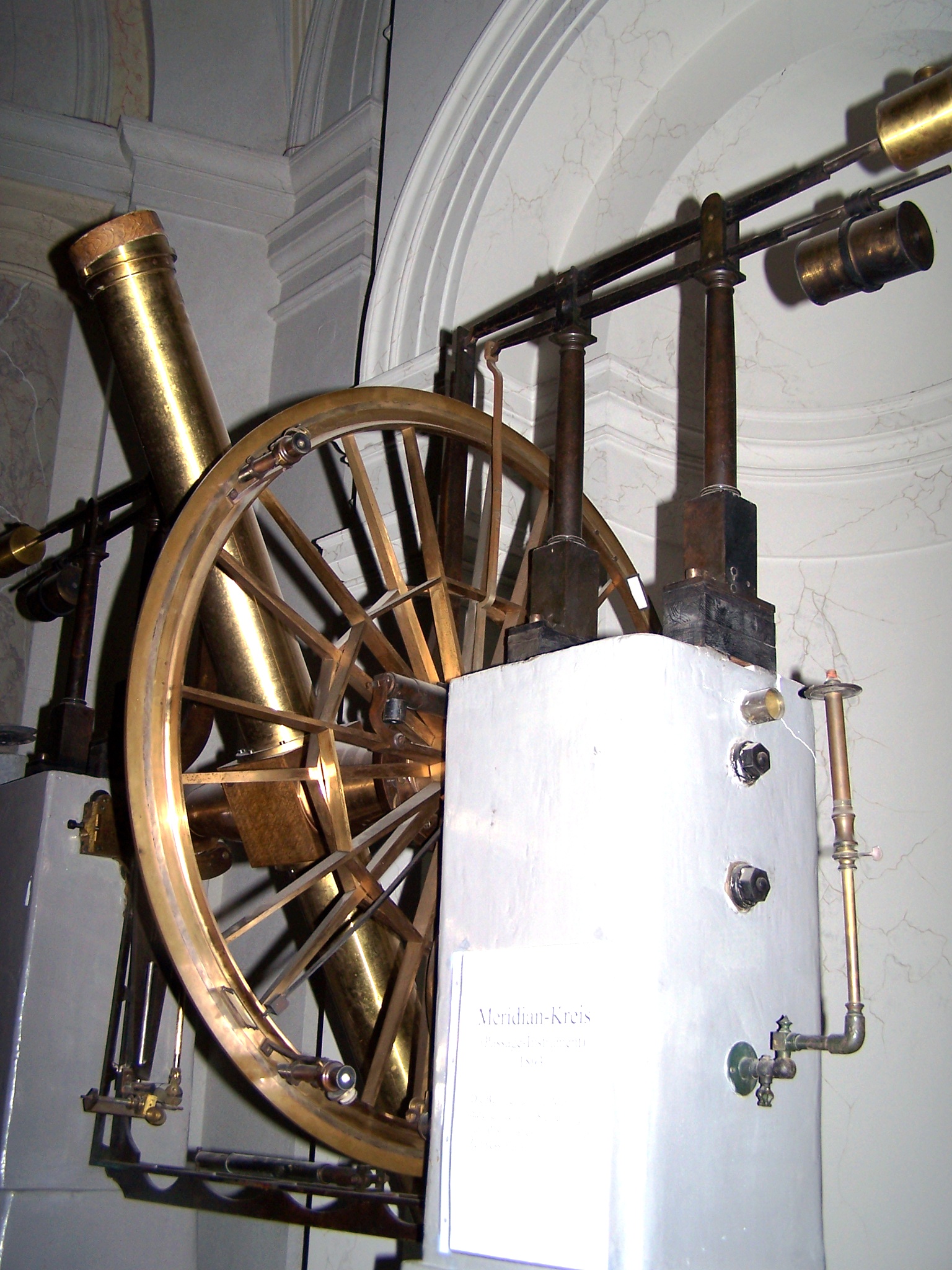 This instrument has a prismatic objective and was built about 1850. The optical axis lies inside the rotary axis of the instrument. Such a compact instrument was used during expeditions. A meridian circle measures the passage of stars through the south or north direction (Meridian). The instrument is located at the museum of the Vienna University Observatory.