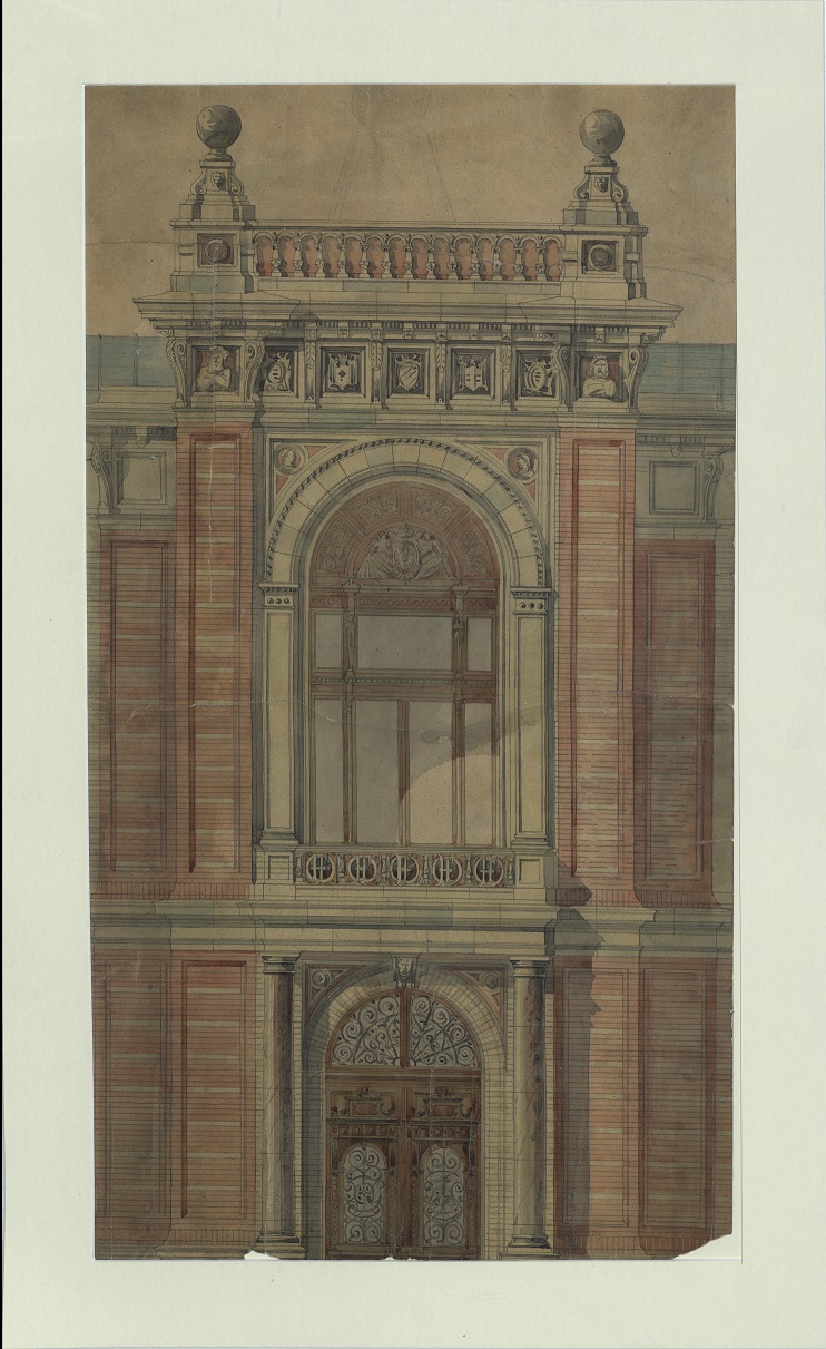 Das Objekt zeigt einen Teil des Südportals der Universitätssternwarte in Wien. Die Ansicht ist auf Karton und handkoloriert. Im Jahre 2012 wurde das Objekjt, welches sich im Archiv der Universitätssternwarte befindet, fachgerecht restauriert. Das Objet o:296003 ist die Fortsetzung dieses Fassadenstückes.